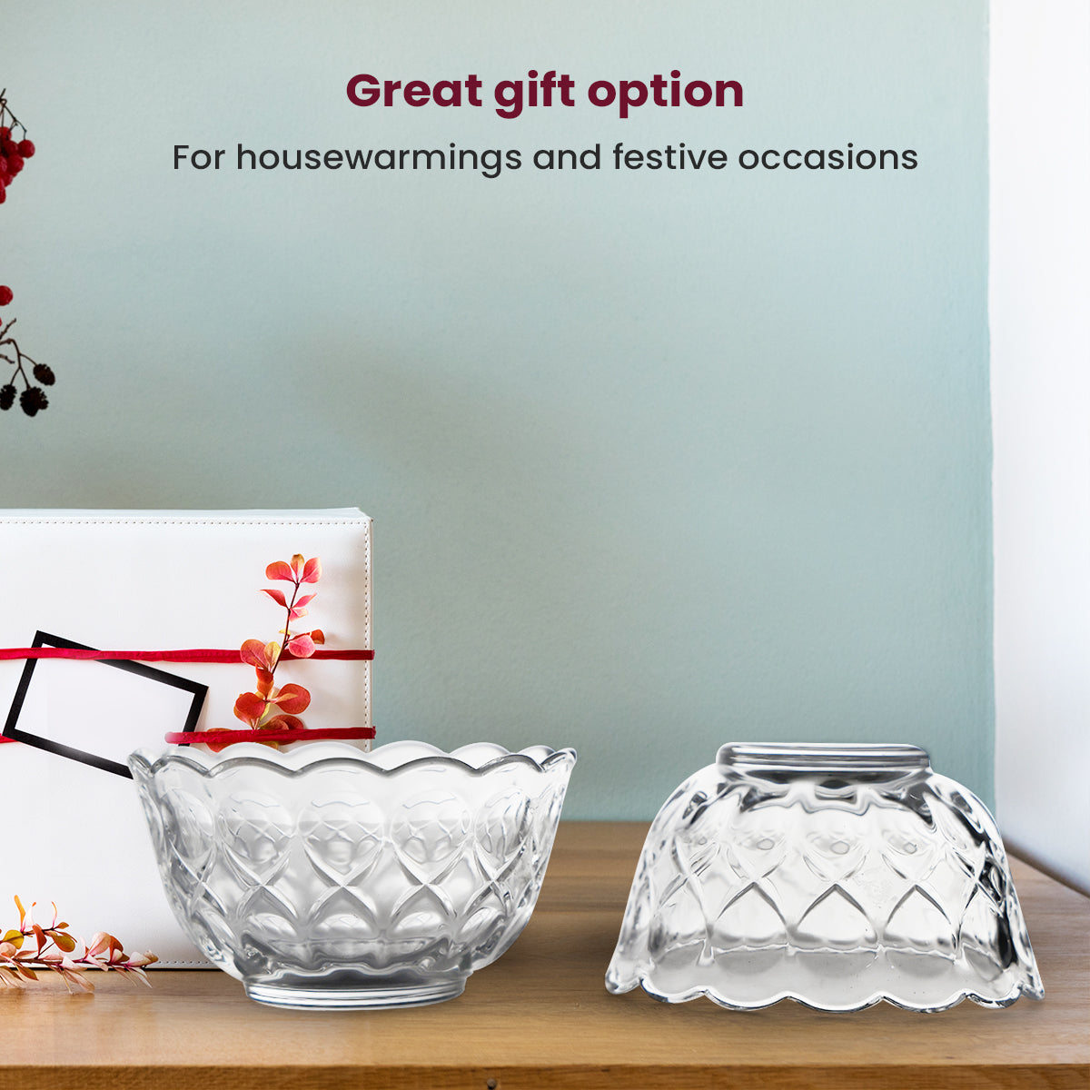 Serve in style with this Crystal-Clear Glass Bowl, designed to bring both charm and functionality to your table. Its gently fluted edges and textured surface create a refined look, making it perfect for salads, desserts, snacks, or dips. Measuring 9×9×5.5 cm, it’s just the right size for personal servings or small portions at family dinners, parties, or casual meals. Built from durable glass, this bowl combines elegance with everyday practicality.