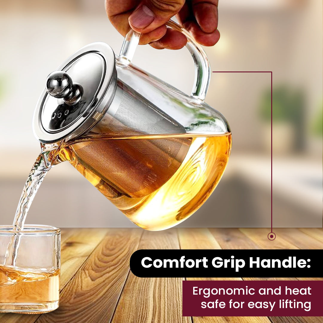 🍃 Borosilicate Glass Body – Strong, lightweight, and heat-resistant for safe brewing. 🫖 Fine Mesh Stainless Steel Infuser – Ensures even steeping and zero tea leaf residue. ✨ Polished Stainless Steel Lid – Adds elegance and retains heat and aroma. ☕ Ergonomic Handle & Spout – Easy to pour without spills or mess. 🧼 Easy to Clean – Infuser is removable; all parts are simple to rinse and reuse. 🎁 Ideal Gift for Tea Lovers – A thoughtful pick for festive gifting or daily luxury.