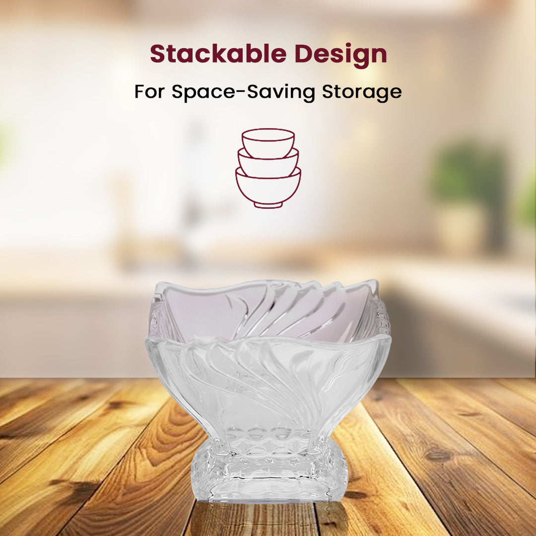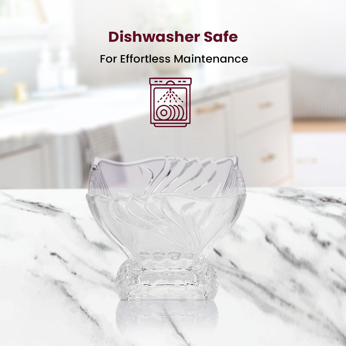 Add a touch of timeless elegance to your serveware collection with this beautifully designed crystal-style glass bowl. Crafted with intricate wave-like detailing and a flared petal-shaped rim, this bowl is perfect for serving desserts, dry fruits, or snacks. Its transparent finish enhances the visual appeal of the contents, making it ideal for both everyday use and special occasions.