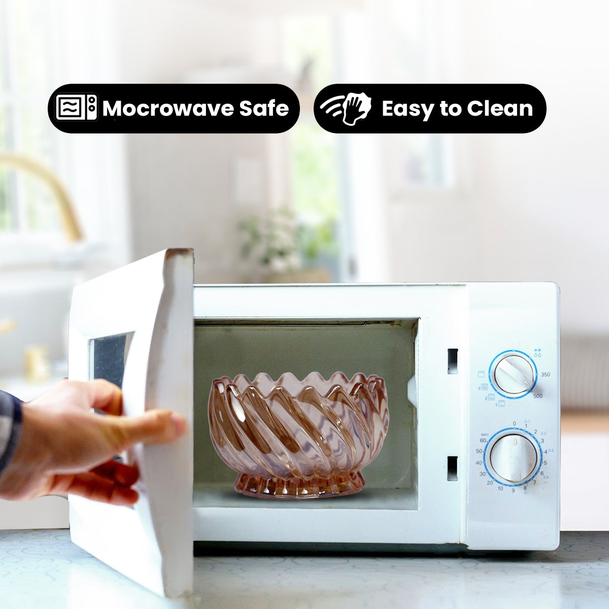 Premium Glass Construction – Durable, clear, and sturdy glass material. Elegant Spiral Design – Eye-catching swirl pattern adds charm to any setting. Golden Hue Finish – Warm, luxurious tone complements modern and classic tableware. Multipurpose Use – Ideal for serving desserts, ice creams, fruits, snacks, or sweets. Wavy Rim & Pedestal Base – Enhances grip and visual appeal. Easy to Clean – Smooth surface makes washing hassle-free.