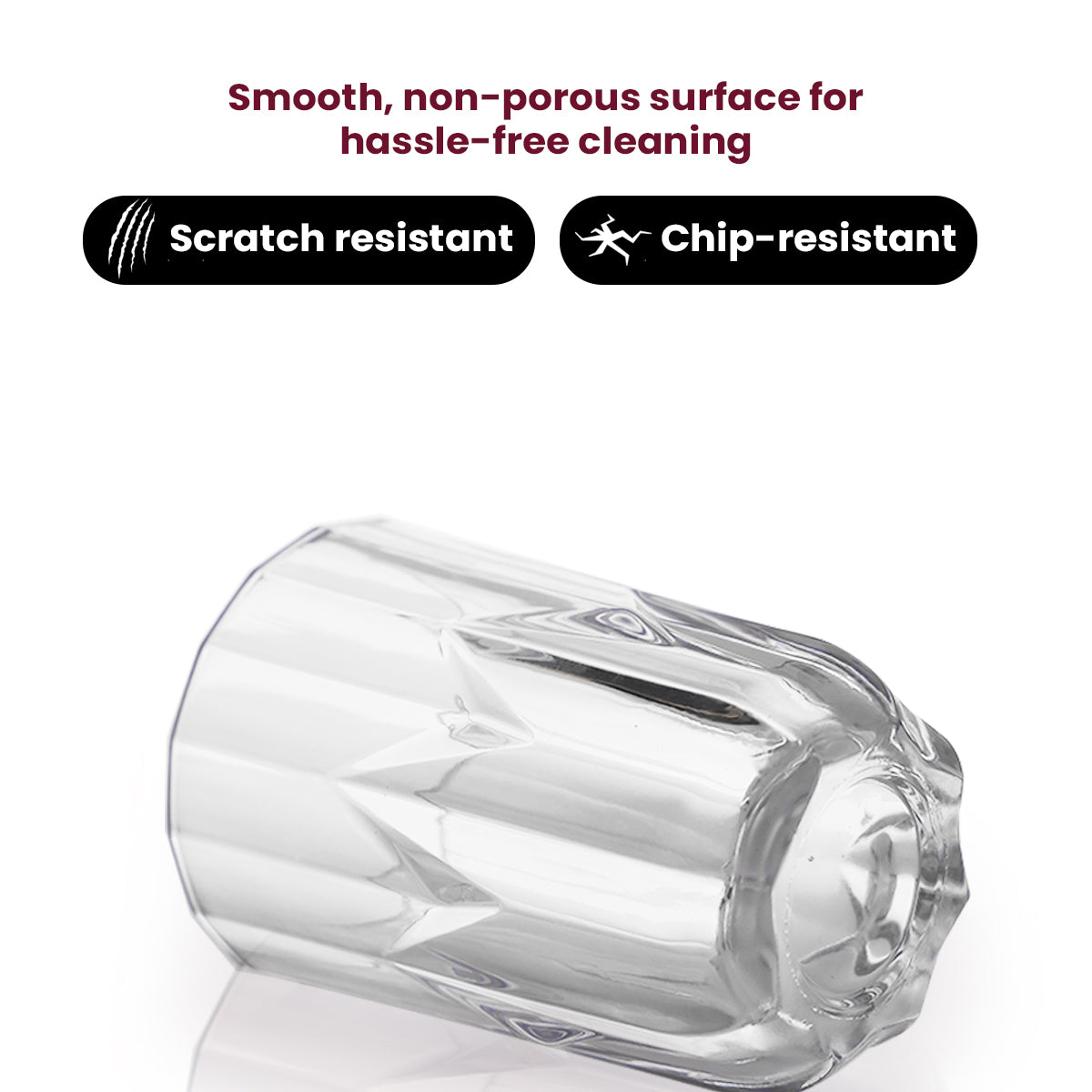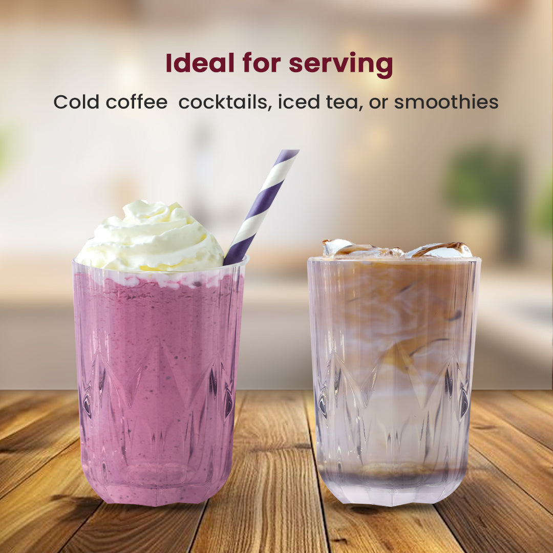 Premium Crystal Clarity – Offers exceptional transparency and brilliance. Elegant Crown Design – Unique geometric cut pattern enhances light refraction. Versatile Use – Ideal for water, cocktails, juice, whiskey, and mocktails. Durable & Dishwasher Safe – Built for everyday use with long-lasting quality. Comfort Grip & Balance – Tapered structure ensures a secure and stylish hold. Lead-Free & Safe – Made with safe materials, ideal for all beverage types.