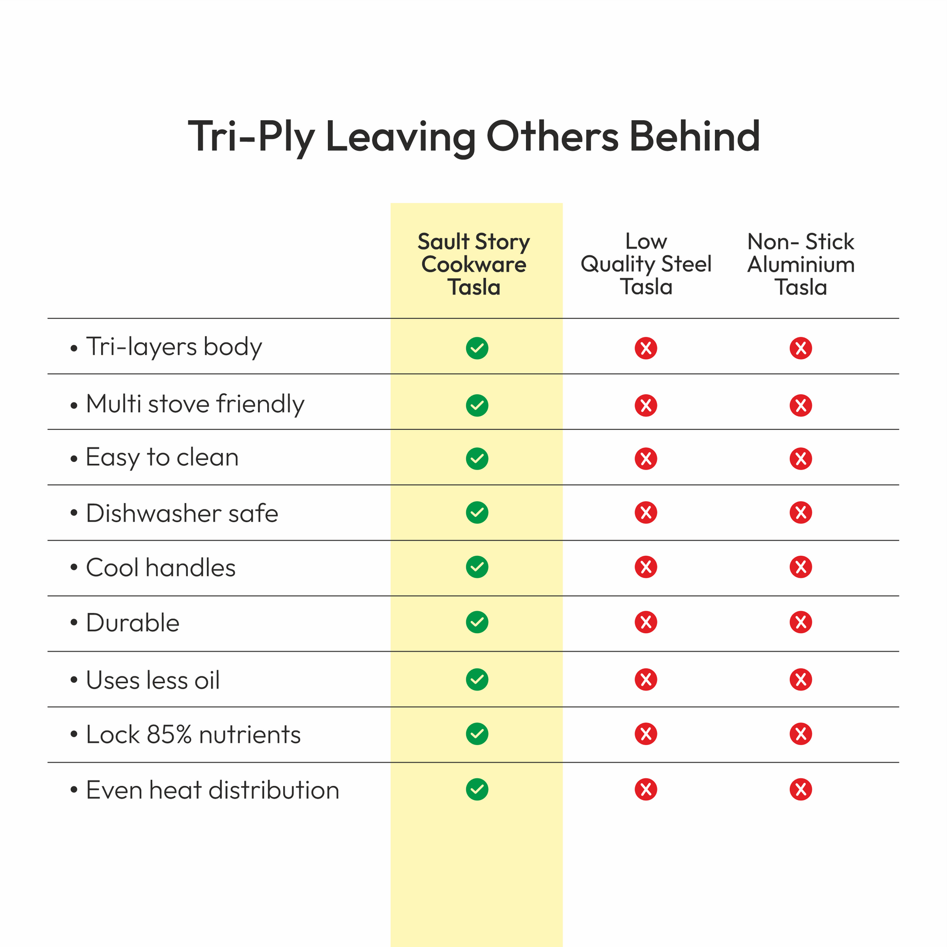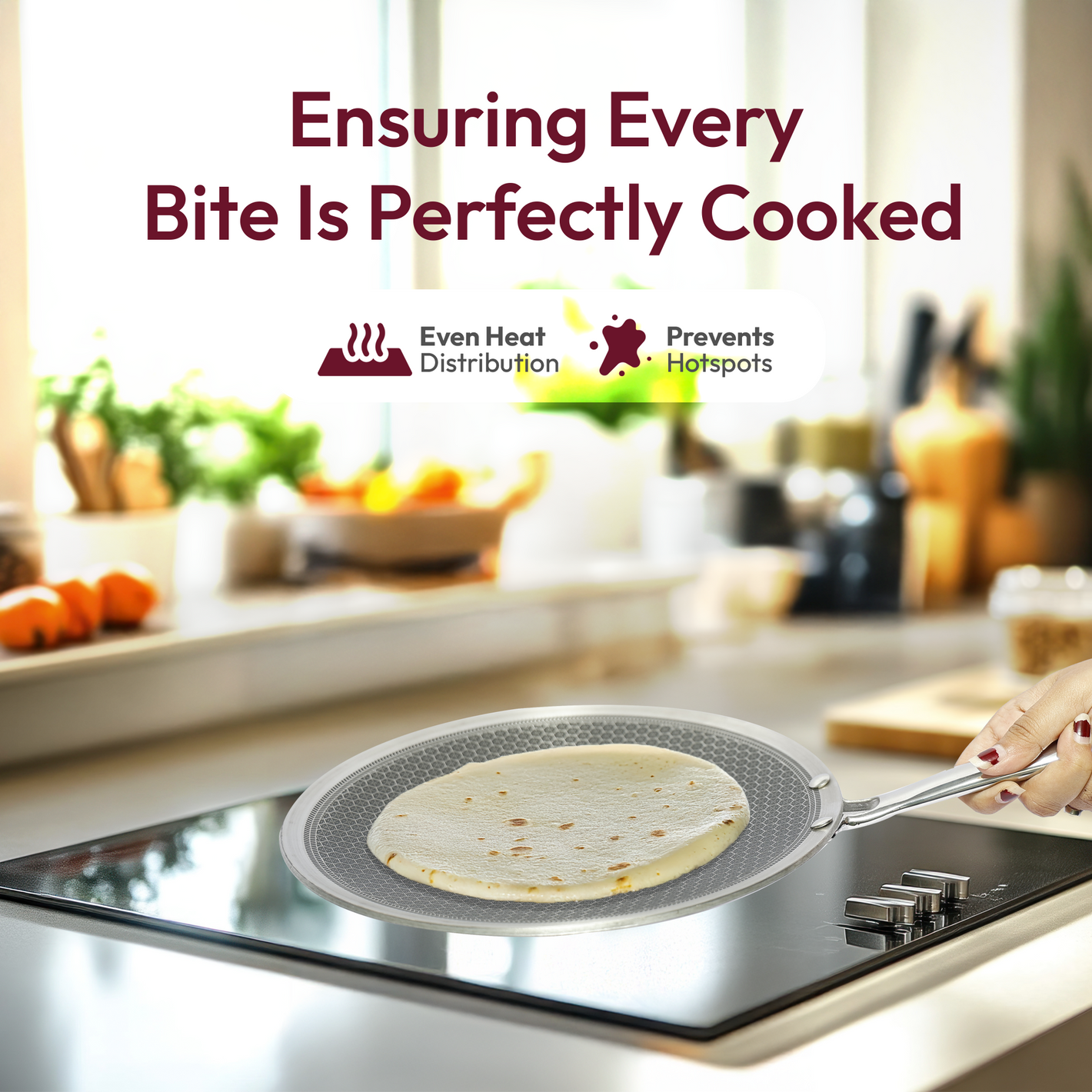 With its triplex construction (stainless steel layers with an aluminum core), this cookware heats evenly and retains heat longer, reducing cooking time while preserving flavor. Compatible with induction, gas, and electric cooktops, it’s built to meet the needs of every modern kitchen.