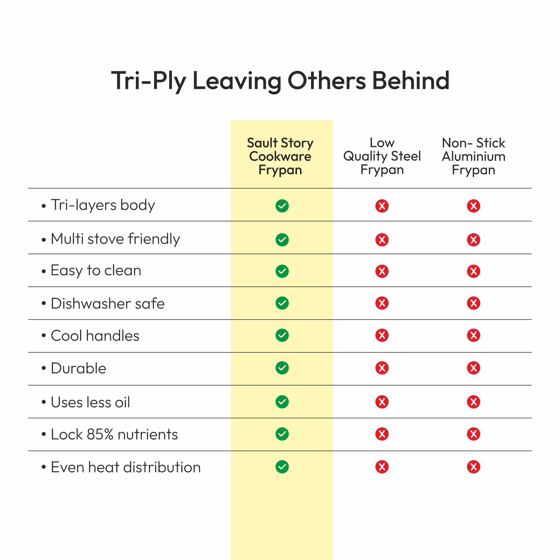 Upgrade your kitchen with this 3-piece premium stainless steel cookware set, designed for versatility, durability, and style. The Hybrid Triplex Tawa (30cm) offers a smooth, stick-resistant surface that’s perfect for making rotis, dosas, pancakes, and crepes. The Triplex Kadhai with Lid (20cm) is ideal for deep frying, sautéing vegetables, and slow-cooking curries while retaining full flavor. The Triplex Frypan (20cm) allows you to sear, shallow fry, or sauté with precision and even heat distribution. Built with high-quality stainless steel and triplex-layer technology, this set delivers professional results in any home kitchen.