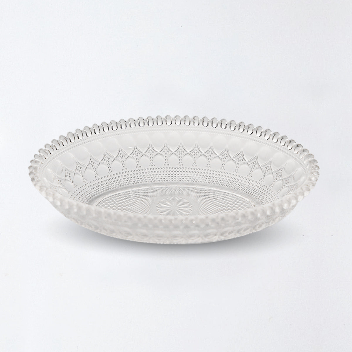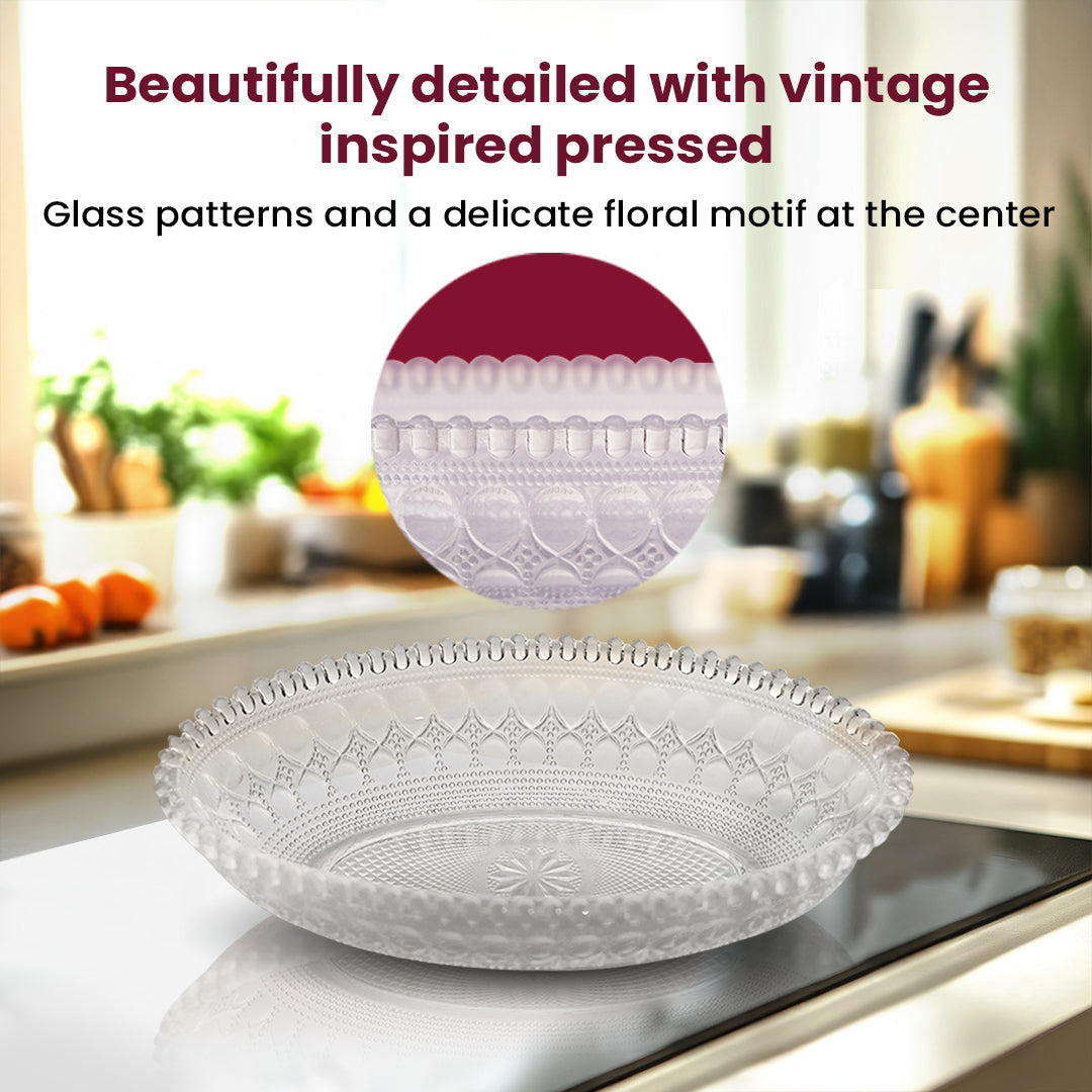 Serve in style with the GLASS ELEGANCE PLATE, a beautifully crafted glass plate designed to bring sophistication to your table. Featuring an intricate floral center and delicate beaded rim, it blends vintage charm with modern durability. Perfect for serving snacks, desserts, or starters, this plate elevates any dining experience. Its clear, premium-quality glass showcases your food with brilliance, making it a must-have for elegant gatherings and everyday meals alike.